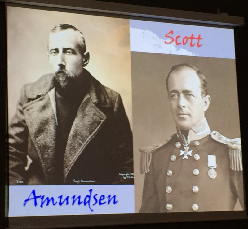 Cette conférence raconte l'épopée de 2 équipes, qui se sont retrouvées quasiment au même moment, au même endroit, avec le même but : atteindre le Pôle Sud Géographique. L'une, norvégienne, menée par Amundsen et l'autre, britannique ,dirigée par Scott ;les deux se sont préparées, mais de façon différente,